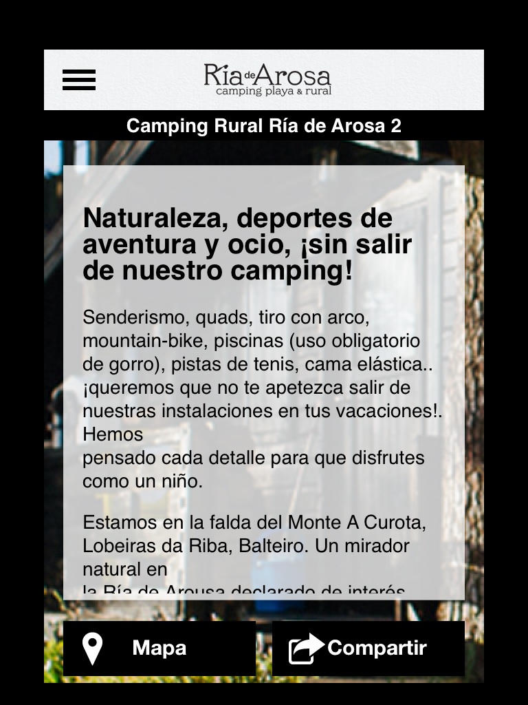 Aquí estamos ante un ejemplo de lo que el CMS Moncake puede dar de sí. Desde un único panel de control gestionamos una app integrada con los contenidos dinámicos de la web, además de tener integrado en la app nativa las reservas, las actividades, y todo la información de Camping Ría de Arosa. Una interfaz hecha ad hoc para la primera app nativa de un camping en España con una navegación muy intuitiva y bien integrada con las funcionalidades de los dispositivos tanto de Android como IOS para smartphones Apple.