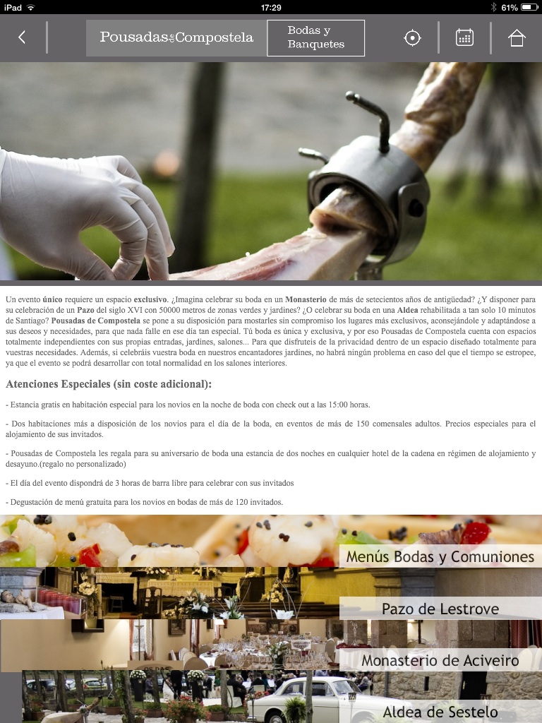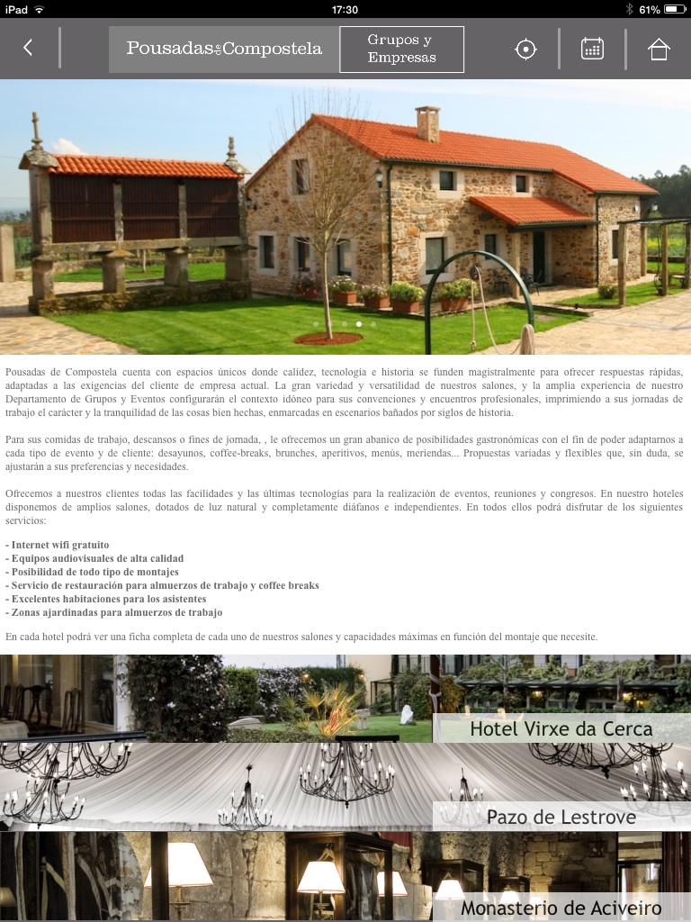 Sucedía el pasado verano, la cadena hotelera gallega Pousadas de Compostela ha lanzado la primera aplicación de un hotel en Galicia para smartphones y tablets con descarga gratuita en el Apple Store y Googleplay. Compatible para Ipads, todas las versiones de iphone, ipod touch y Ipad mini, así como cualquier dispositivo que utilice el sistema Android, oferta una compatibilidad para más del 90% de los dispositivos del mercado.