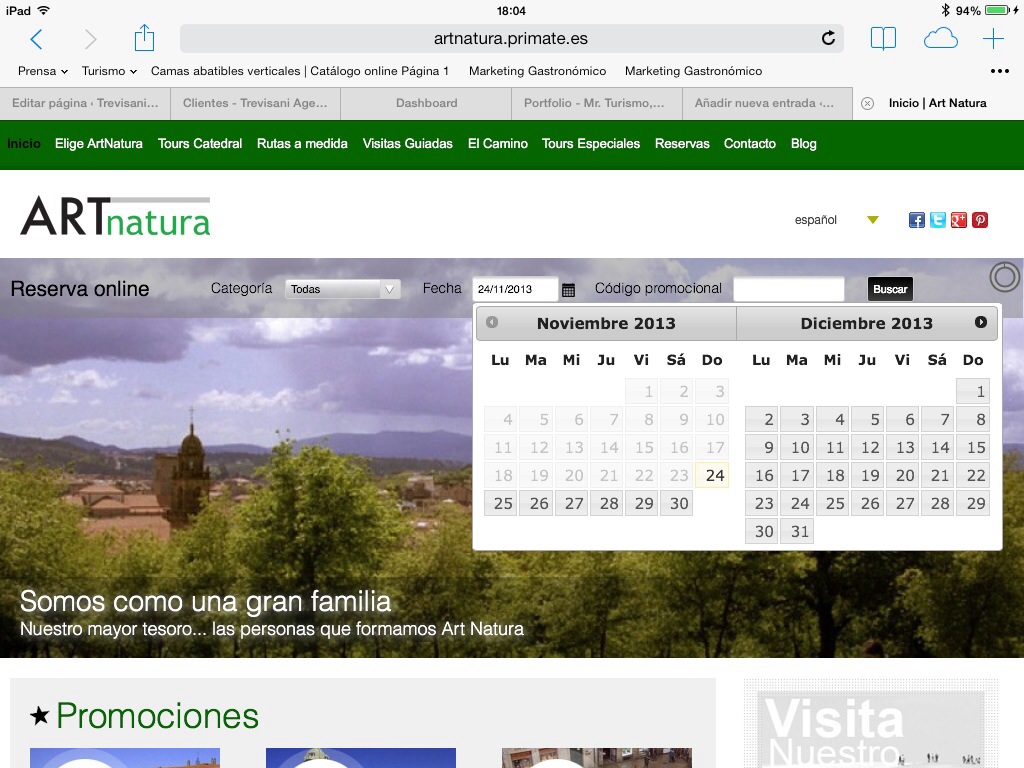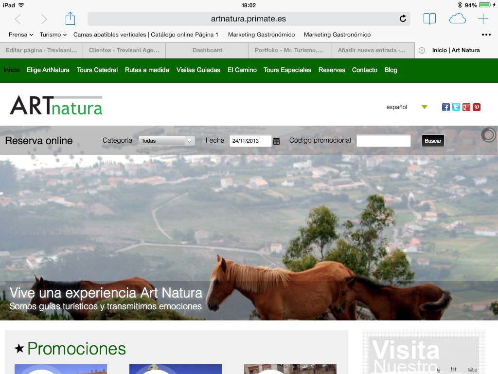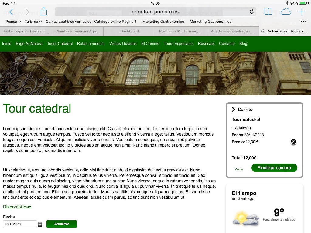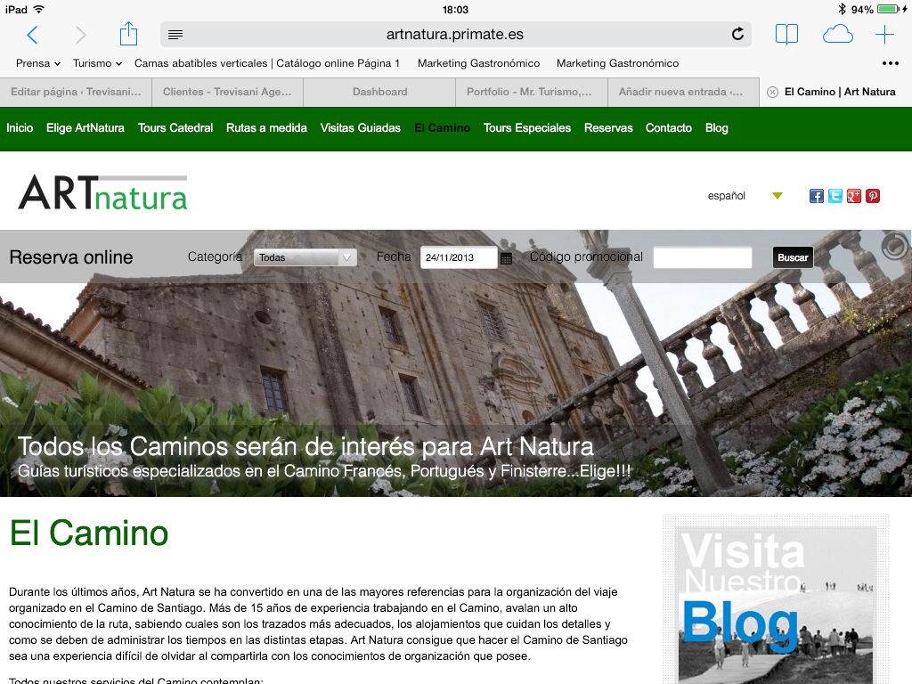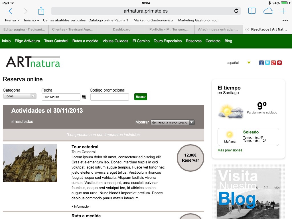 A punto está de salir a la calle la nueva web de Art Natura, empresa compostelana que presta servicios de guías turísticos desde hace más de 20 años. La novedad es que este trabajo sale a la calle con el CMS Moncake, lo que demuestra, una vez más, la versatilidad de esta herramienta con la que colabora Mr Turismo desde hace un año. El Moncake se adapta esta vez, a una empresa que organiza visitas guiadas con a la Catedral de Santiago con salida garantizada, entre otros productos como excursiones con guía conductor por ejemplo. La novedad es que con el Moncake se pasa a la venta on line directa con pasarela de pago en el momento, con el que los turistas podrán reservar con todas las garantías desde cualquier parte del mundo, emitiendo localizador y bono de la reserva con todas las garantías que una reserva on line de cualquier tipo.
