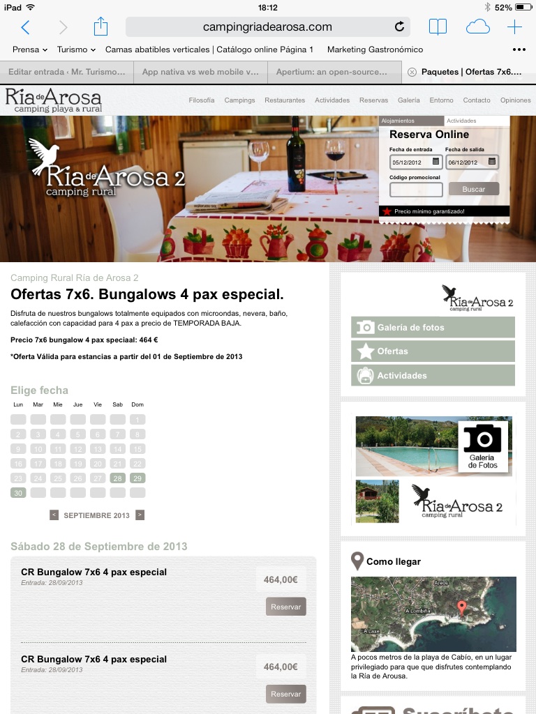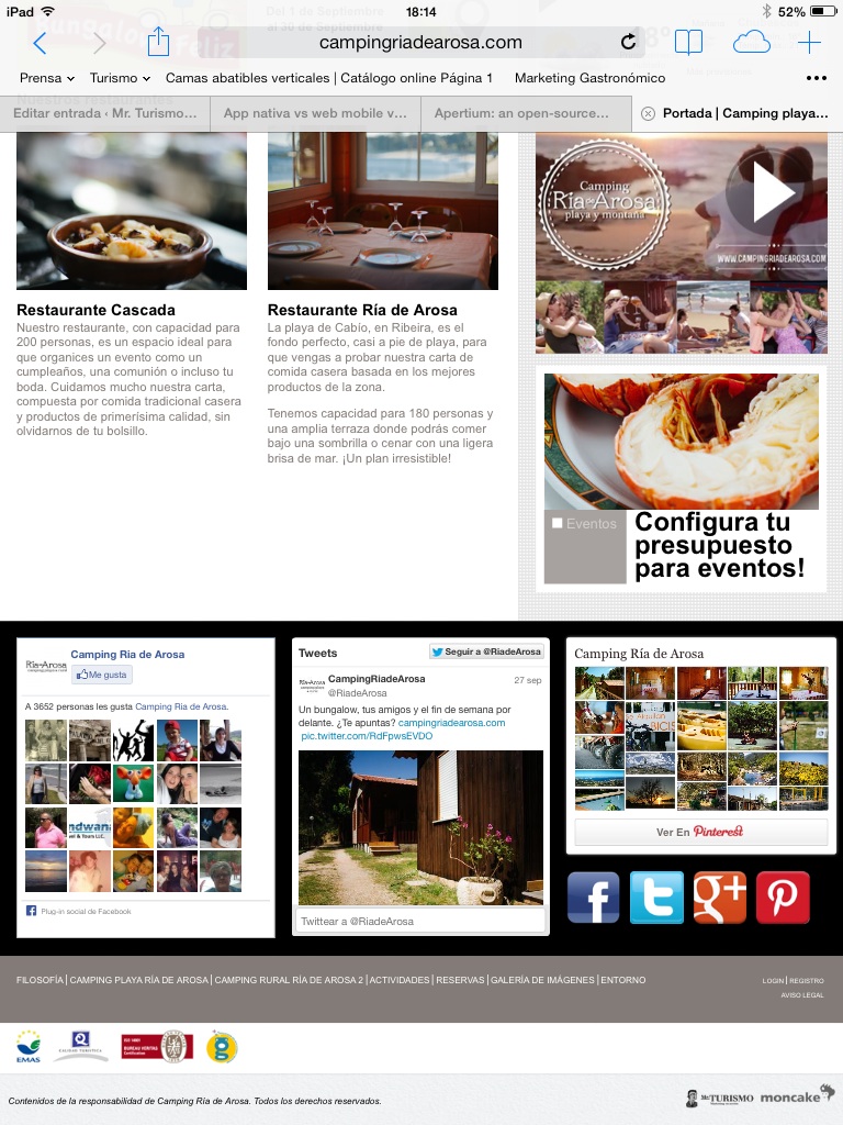 Otra adaptación del CMS Moncake esta vez para un camping con las particularidades que ello conlleva. Motor de reservas on line con carga de disponibilidad de parcelas y bungalows, adaptación a la venta por parcelas y conceptos, motor con paquetización dinámica para ventas de actividades y alojamiento con carrito de la compra, agenda de actualidad, gestor de comentarios, gestor de circuitos, ofertas, paquetes, timeline de redes, gestor de menús para banquetes, galería de fotos, ofertas y actividades por microsite y todas las funcionalidades del CMS Moncake esta vez para un histórico del campismo en Galicia.